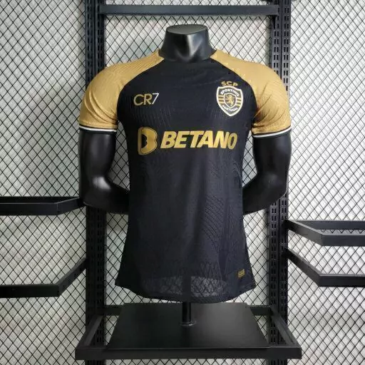 Apresentamos a Camisa do Sporting CP x CR7 Third 23/24 Player Version Masculina - Preto e Dourado, uma peça única que combina a tradição do clube com o estilo marcante de CR7. Ideal para torcedores e colecionadores que valorizam design, conforto e qualidade premium.